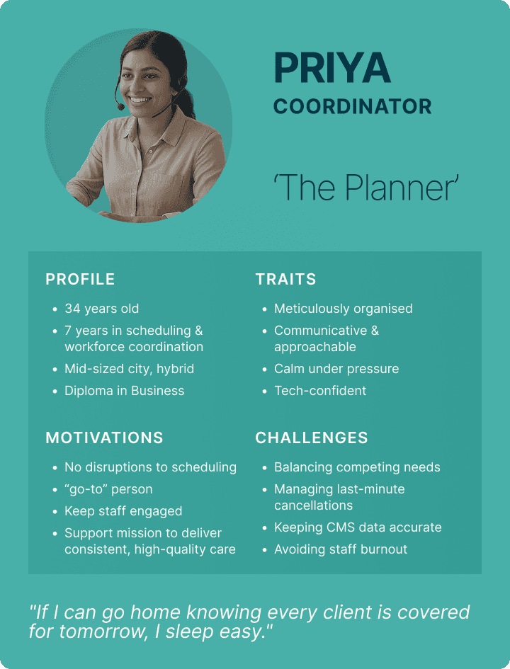 The coordinator team have to problem solve and manage the shifts and health worker schedules, resolving issues to ensure people receive the care they need.